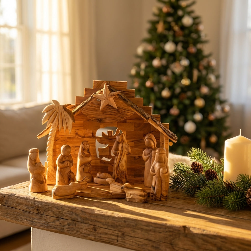 The large wooden Nativity set you are describing is a hand-carved Olive Wood Music Box Nativity Scene from the Holy Land. It serves as both a beautiful Christmas tree decoration and a representation of the Holy Family in the manger scene.